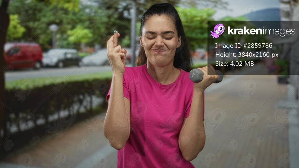 Young hispanic woman crosses fingers with one hand and grips a 1kg dumbbell with the other on a tree lined street; hope.