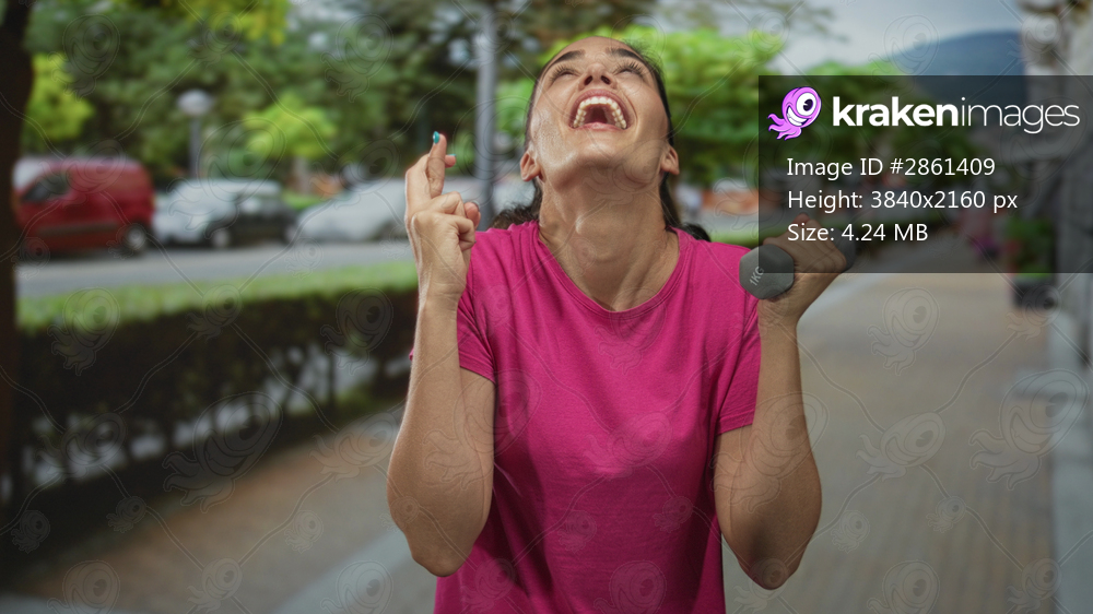 Young hispanic woman crosses fingers with one hand and grips a 1kg dumbbell with the other on a tree lined street; hope.