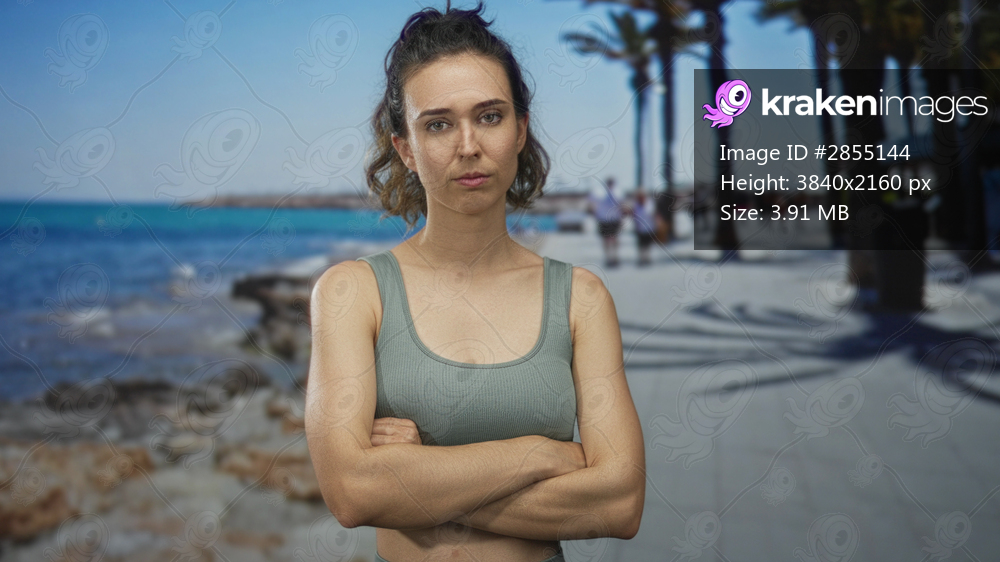 Young hispanic woman crossing arms in tank top on seaside street with palm trees; defiance solitude.
