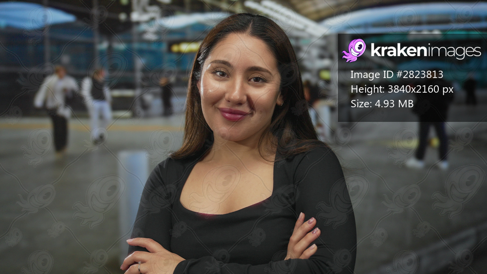 Young hispanic woman crossing arms and winking at a busy airport terminal under overhead canopy; confidence.