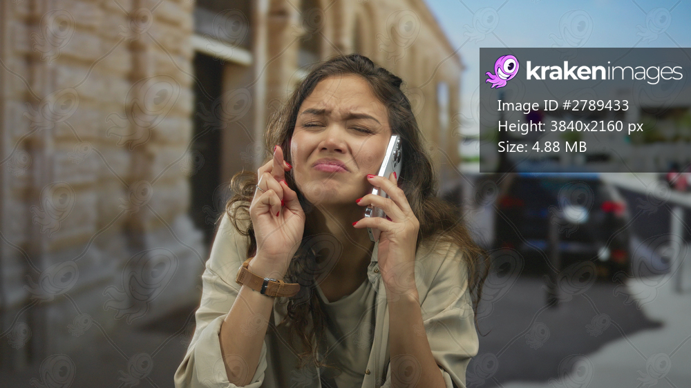 Young hispanic woman crossing fingers holding smartphone while talking outdoors on street with historic building facade; hope.