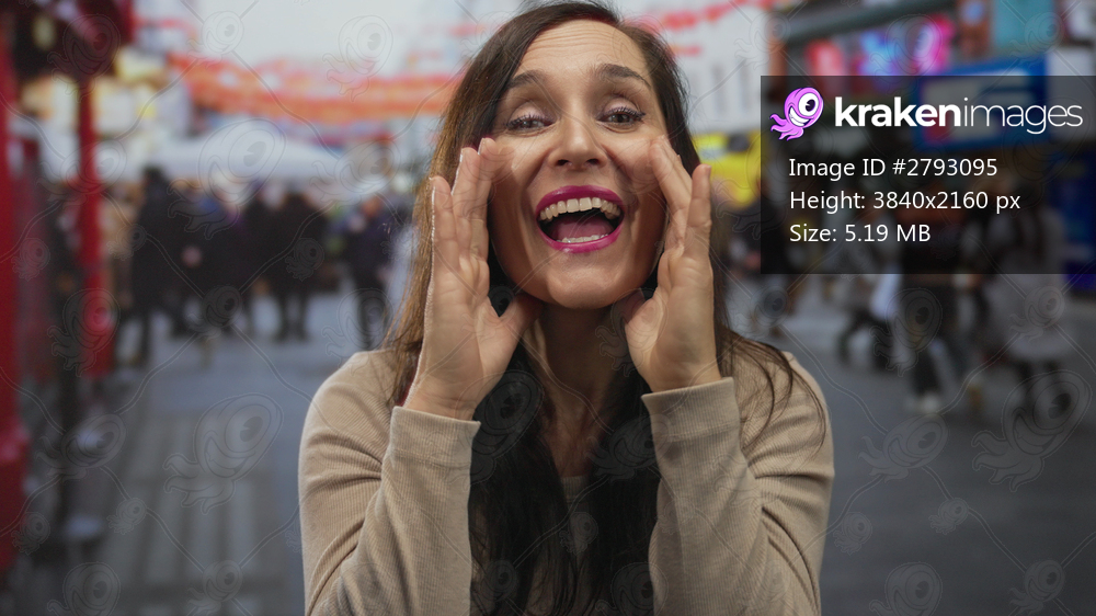 Young hispanic woman cupping hands around mouth shouting at busy urban street corner in daylight; announcement urgency excitement.