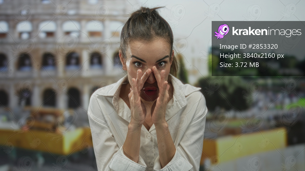 Young hispanic woman cupping hands around mouth while shouting in front of coliseum; intense determination.