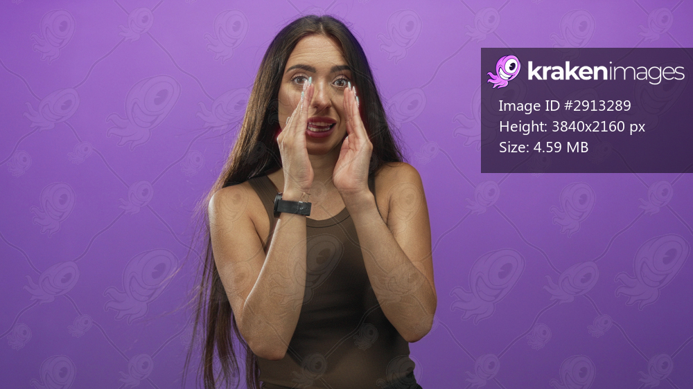 Young hispanic woman cupping hands to mouth in purple studio wearing brown tank top and smartwatch; urgent message.