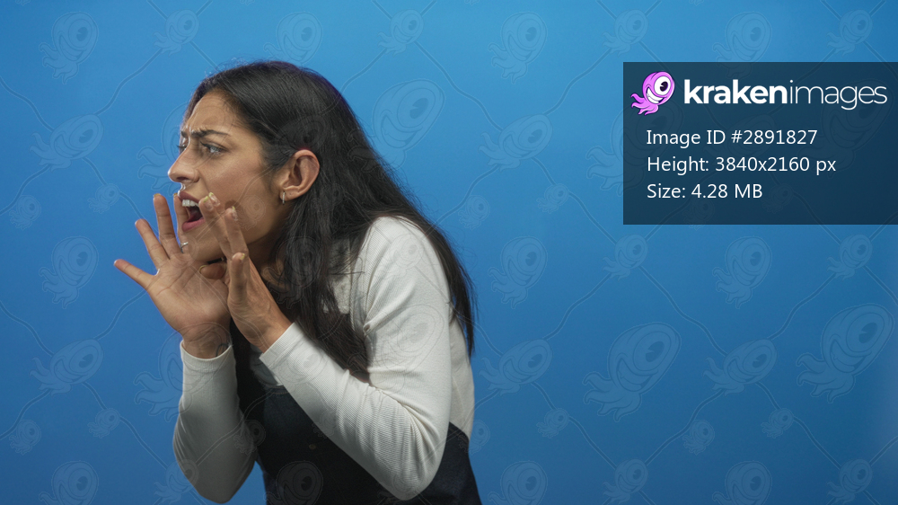 Young hispanic woman cupping hands to mouth, shouting in blue studio with visible hands and face; frustration protest.