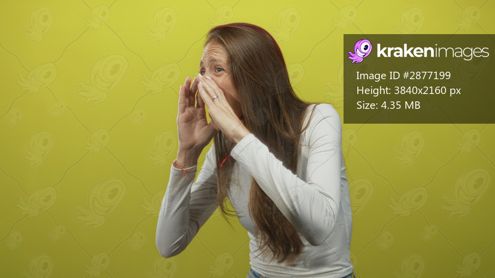 Young hispanic woman cupping hands to shout in studio with vivid yellow backdrop and long hair visible; urgency warning.