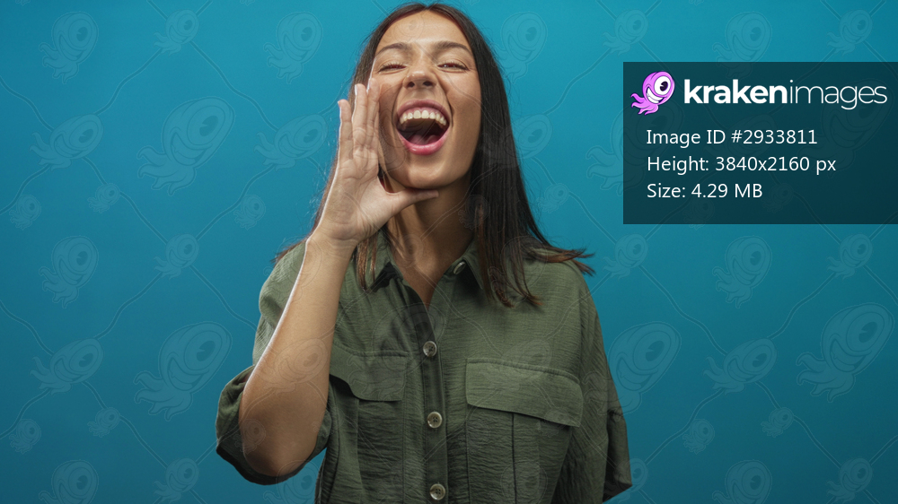 Young hispanic woman cupping hands to shout and wave in studio against teal blue backdrop, wearing olive shirt; joyful greeting energy.