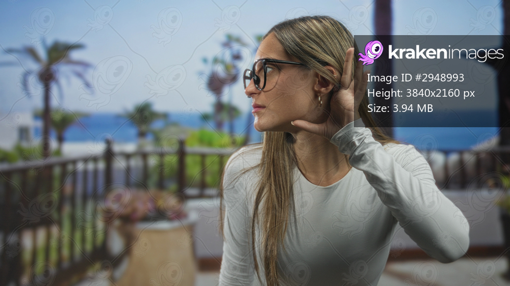 Young hispanic woman cups ear with hand and turns her head while wearing glasses on a building balcony overlooking the ocean, listening; curiosity.