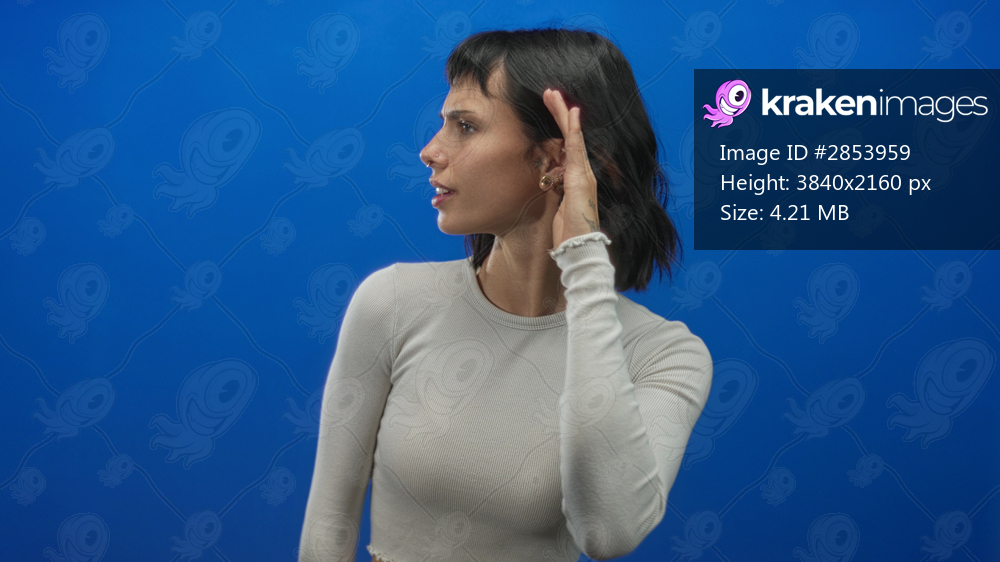 Young hispanic woman cups ear in bright studio with vivid blue wall showing listening gesture; curiosity.