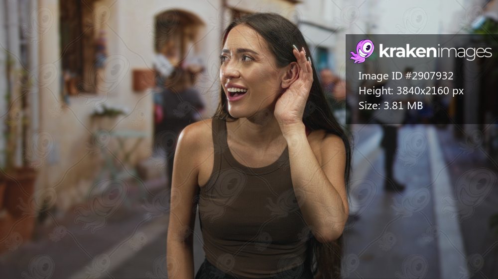 Young hispanic woman cups hand to ear on a bustling street with visible bare shoulder and brown tank top; curiosity.