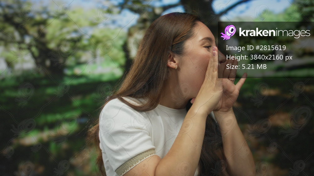 Young hispanic woman cups hands to mouth shouting energetically in sunlit green park with leafy trees; excitement.