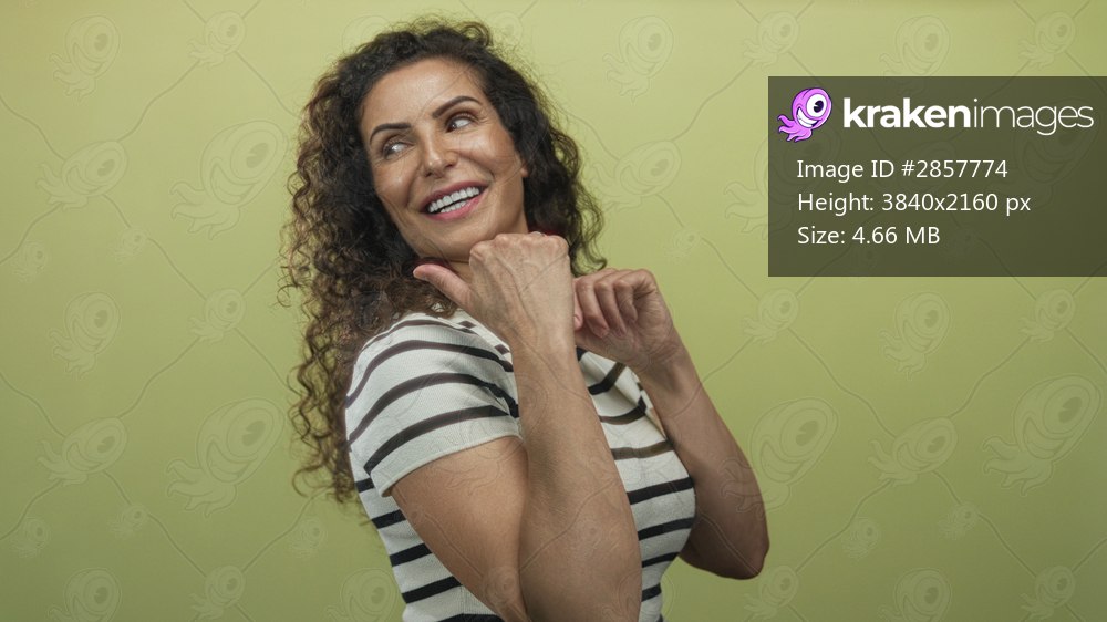 Young hispanic woman with curly brown hair smiling points thumb to chest in green studio; confidence.