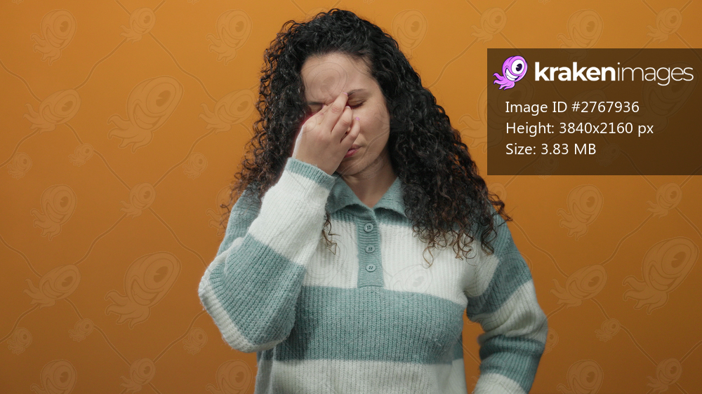 Young hispanic woman with curly hair expressing frustration against an isolated orange background wall capturing a moment of stress and contemplation.