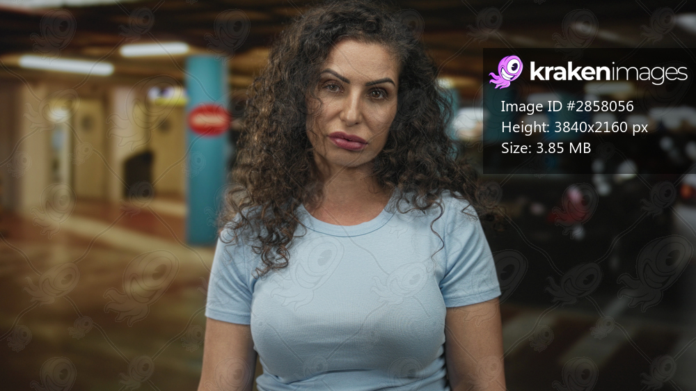 Young hispanic woman with curly hair glances sideways at a parked car in a multilevel parking garage; boredom.