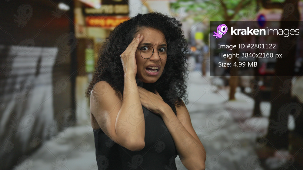 Young hispanic woman with curly hair and glasses clutching chest on street amid blurred urban buildings and trees; fear.