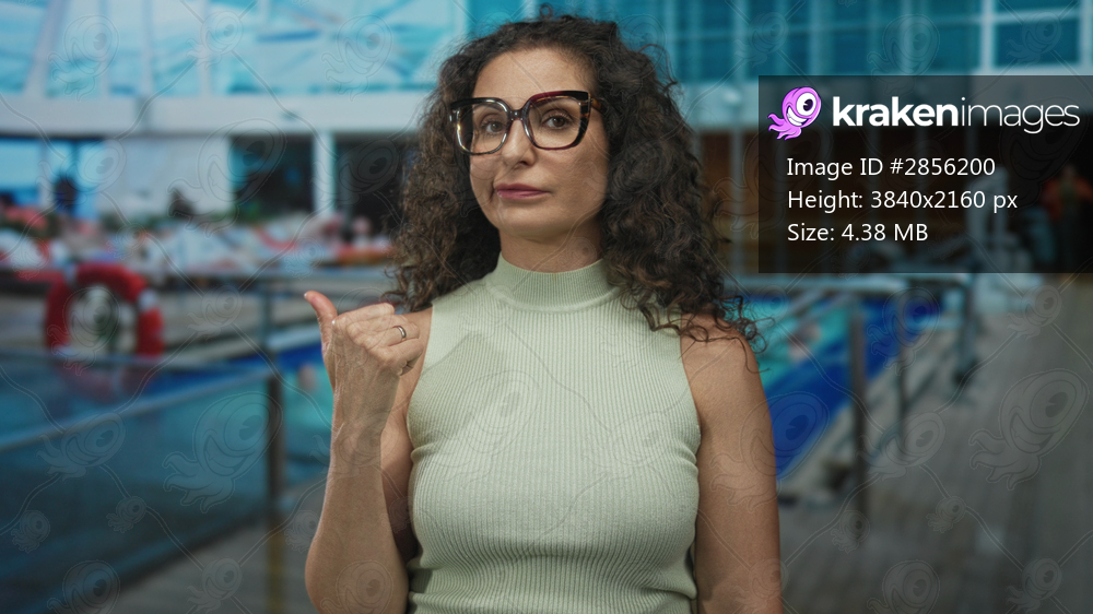 Young hispanic woman with curly hair and glasses pointing her thumb to the side by cruise ship deck railing in building; confidence.
