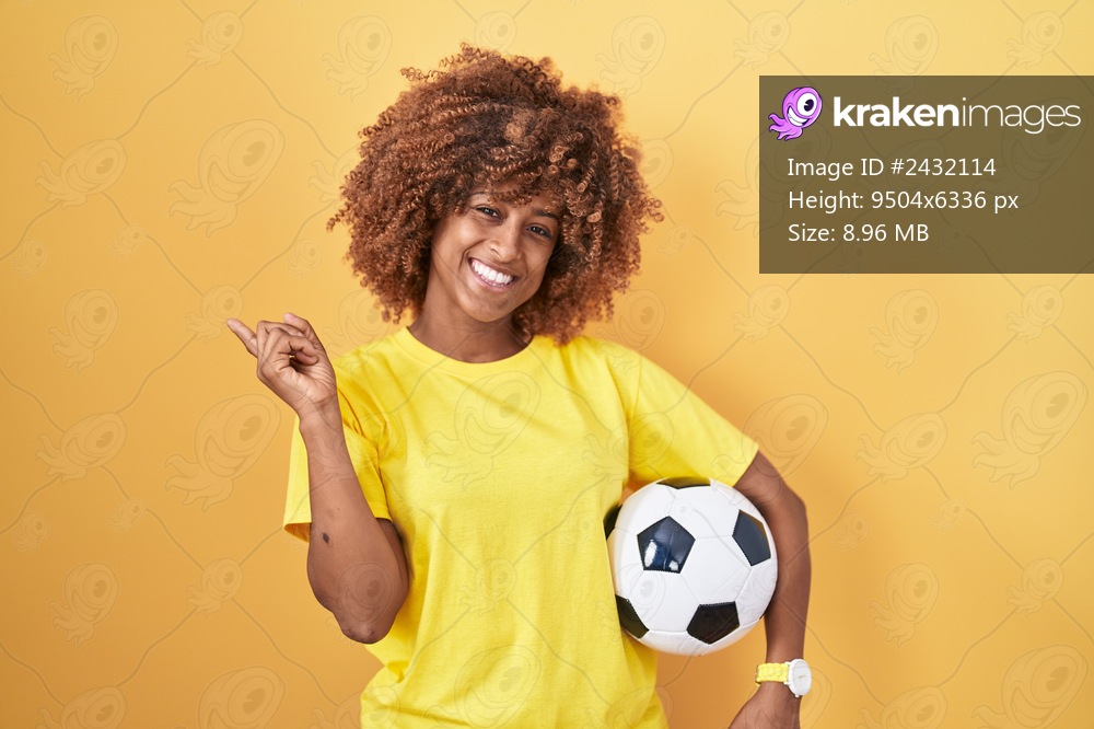 Young hispanic woman with curly hair holding football ball smiling happy pointing with hand and finger to the side