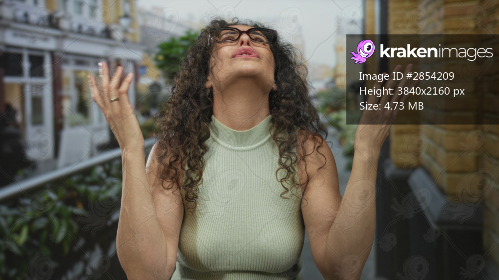 Young hispanic woman with curly hair in green top and glasses crosses arms on street; confidence defiance strength determination.