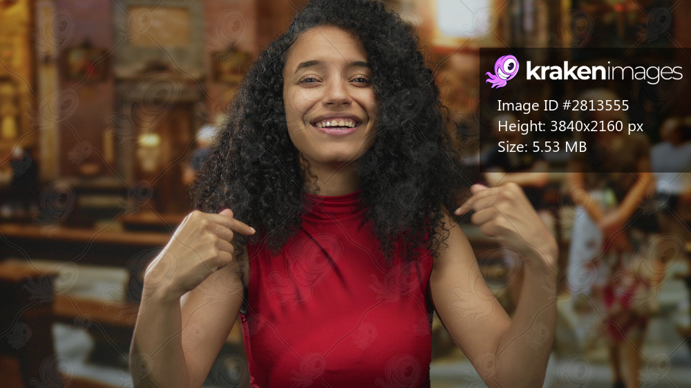 Young hispanic woman with curly hair in red top points finger to herself in a church building; self confidence.