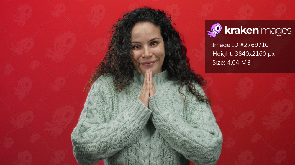 Young hispanic woman with curly hair in sweater smiling against red background displaying gratitude and warmth.