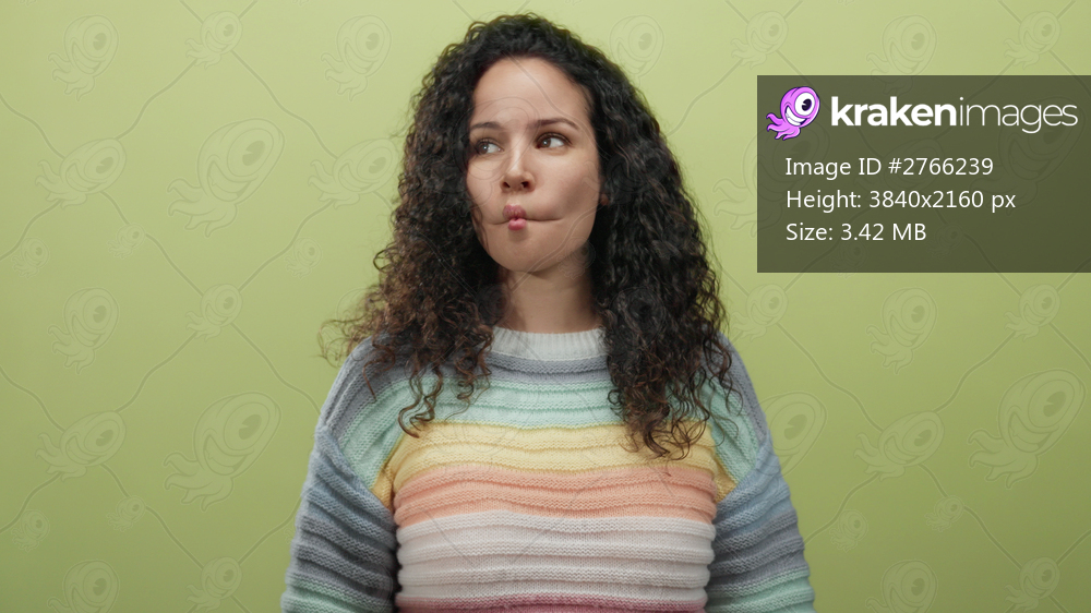 Young hispanic woman with curly hair makes a playful fish face expression against a soft yellow wall background, wearing a colorful sweater, isolated and casual. - Kraken Images