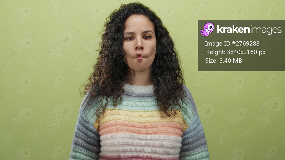 Young hispanic woman with curly hair makes a playful fish face expression against a soft yellow wall background, wearing a colorful sweater, isolated and casual. - Kraken Images