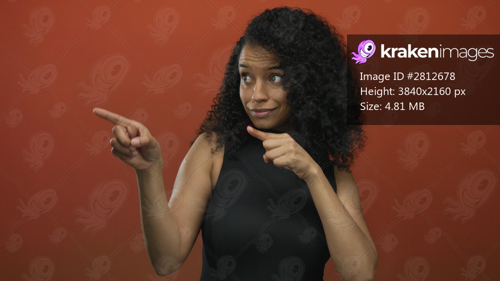 Young hispanic woman with curly hair pointing with both hands against a vibrant red wall showcasing an expressive gesture in a modern studio environment. - Kraken Images