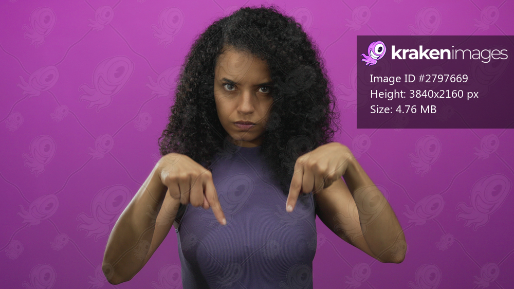 Young hispanic woman with curly hair points fingertips downward in studio against pink wall; attention direction emphasis.