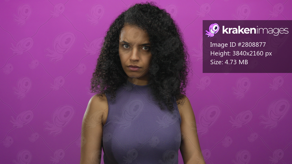 Young hispanic woman with curly hair points fingertips downward in studio against pink wall; attention direction emphasis.