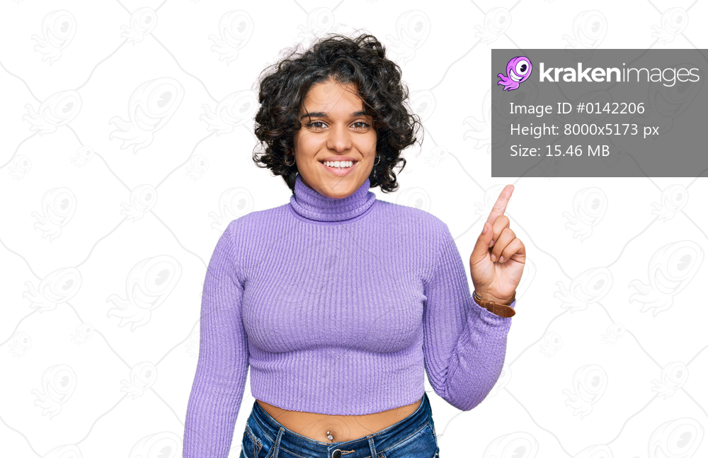 Young hispanic woman with curly hair wearing casual clothes with a big smile on face, pointing with hand finger to the side looking at the camera.