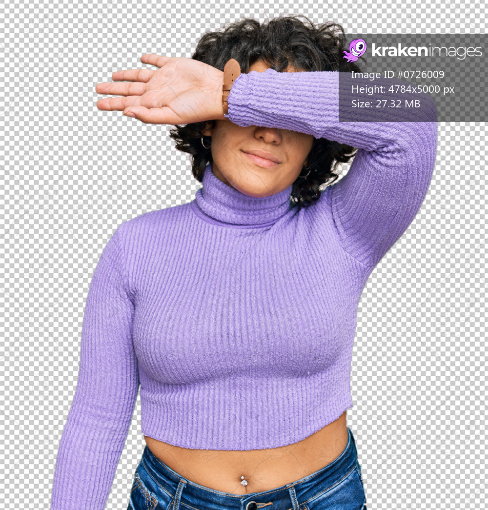 Young hispanic woman with curly hair wearing casual clothes covering eyes with arm, looking serious and sad. sightless, hiding and rejection concept