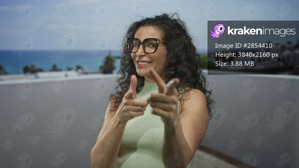 Young hispanic woman with curly hair wearing glasses pointing finger at camera in building; playfulness.