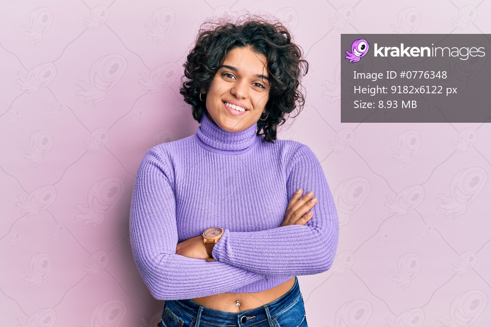 Young hispanic woman with curly hair wearing turtleneck sweater happy face smiling with crossed arms looking at the camera. positive person.