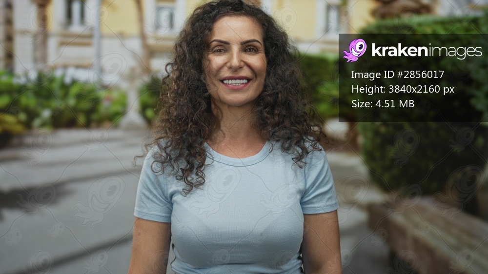 Young hispanic woman with dark curly hair winks with one eye on a sunlit city street; playful charm carefree spirit.