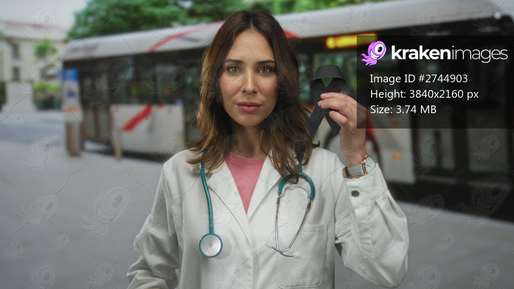 Young hispanic woman doctor holding black ribbon with stethoscope outdoors on city street near bus showcasing alertness and professionalism.