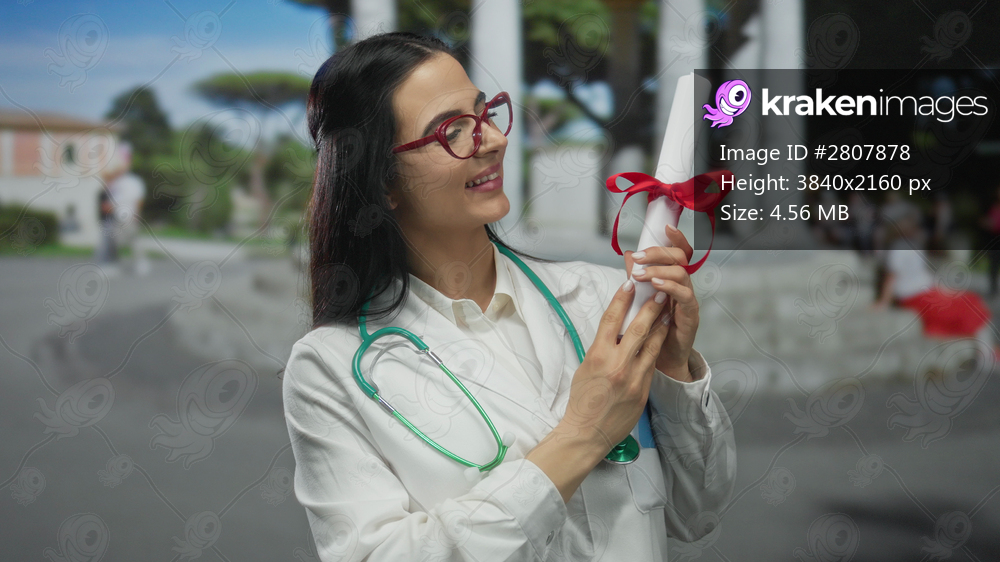 Young hispanic woman doctor holding diploma with stethoscope on street celebrating graduation outdoors in uniform.