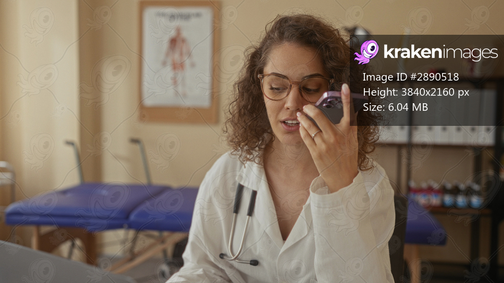 Young hispanic woman doctor holding phone to mouth with stethoscope in clinic; calm focus telemedicine.