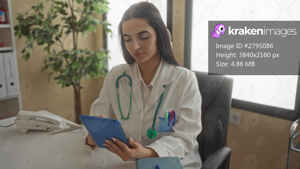 Young hispanic woman doctor in a clinic room with a stethoscope using a tablet, surrounded by medical equipment and plants.