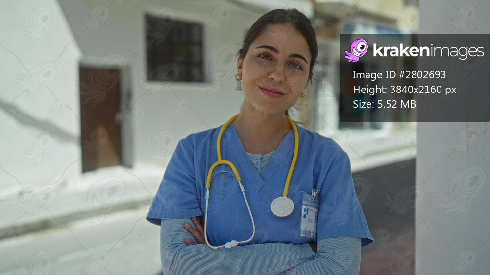 Young hispanic woman doctor in blue uniform crosses arms while holding yellow stethoscope in sunlit street; rejection.
