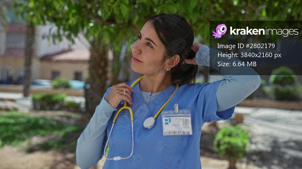 Young hispanic woman doctor in blue uniform with stethoscope enjoys a sunny day outdoors in a green park setting, showing a casual and relaxed side of healthcare professionals. - Kraken Images
