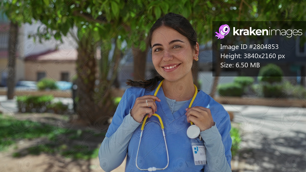 Young hispanic woman doctor in blue uniform with stethoscope enjoys a sunny day outdoors in a green park setting, showing a casual and relaxed side of healthcare professionals. - Kraken Images