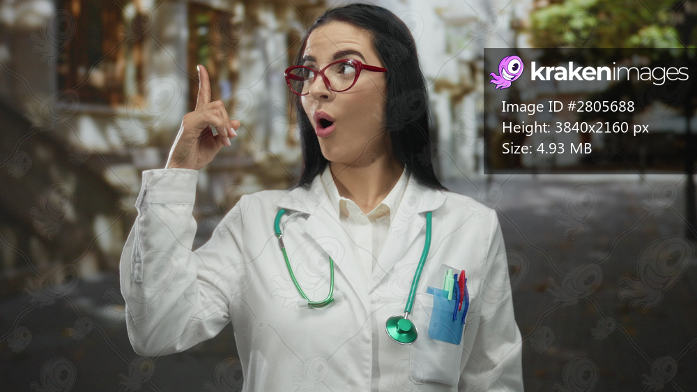 Young hispanic woman doctor in outdoor street scene gesturing having creative idea while wearing stethoscope and uniform with thoughtful expression.