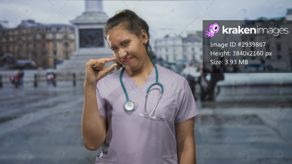 Young hispanic woman doctor in scrubs with stethoscope pinches fingertips on city street in front of building; small playful gesture.