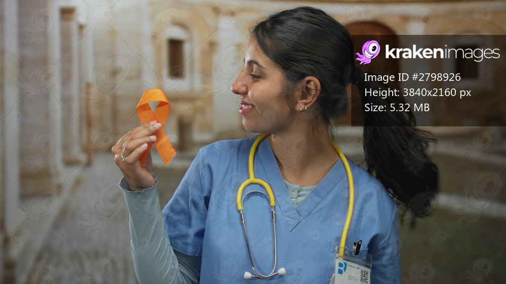 Young hispanic woman doctor in uniform holds orange ribbon outdoors in old town, symbolizing awareness and care.