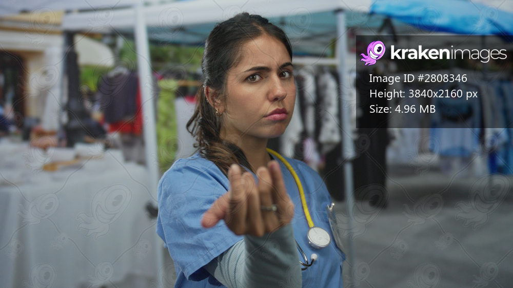 Young hispanic woman doctor in uniform and stethoscope beckons with hand on street in front of market stalls; invitation.