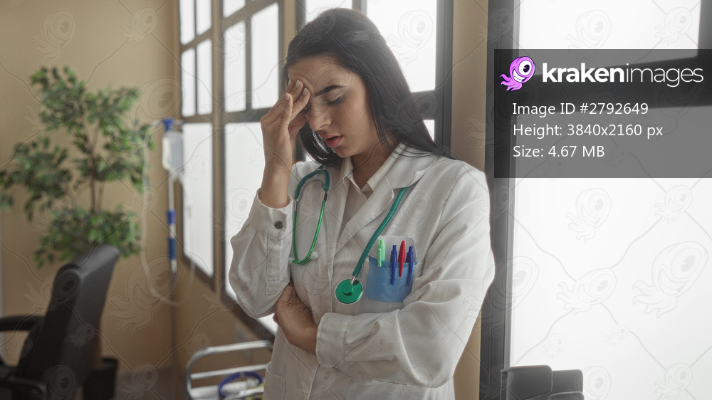 Young hispanic woman doctor in uniform with stethoscope looking stressed in a hospital clinic room, highlighting the challenges of her profession in a medical environment. - Kraken Images