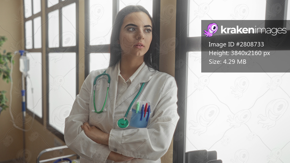 Young hispanic woman doctor in uniform with stethoscope looking stressed in a hospital clinic room, highlighting the challenges of her profession in a medical environment. - Kraken Images