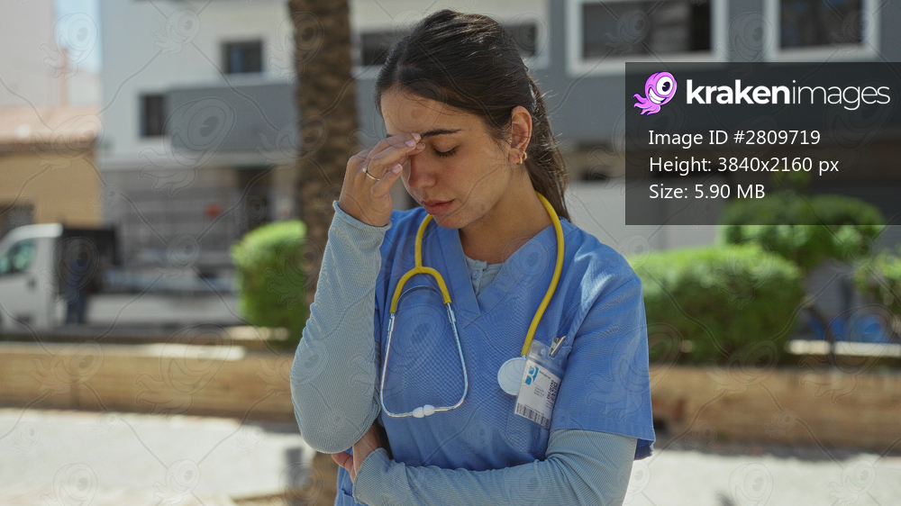 Young hispanic woman doctor in uniform with stethoscope standing outdoors on street, expressing fatigue under sunlight, showing a moment of emotional stress. - Kraken Images