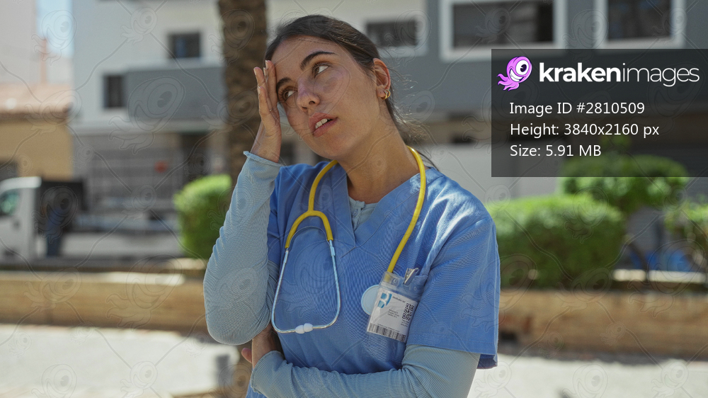 Young hispanic woman doctor in uniform with stethoscope standing outdoors on street, expressing fatigue under sunlight, showing a moment of emotional stress. - Kraken Images