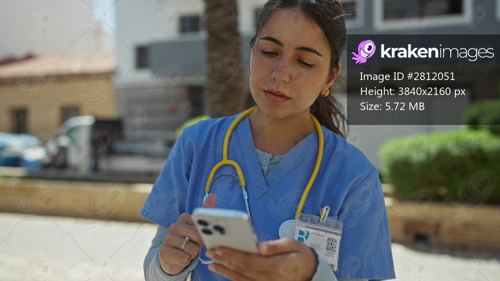 Young hispanic woman doctor in uniform with stethoscope uses smartphone outdoors on street during daytime